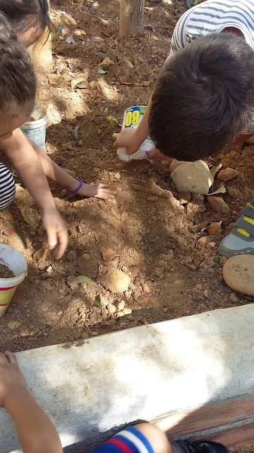 Παίρνουμε λίγο χώμα από το λαχανόκηπο για το φυτώριο μας. |