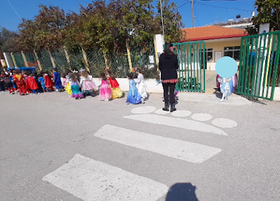 Και γεμάτοι πια ενέργεια...κάνουμε την μικρή καρναβαλική μας παρέλαση στο τετράγωνο του σχολείου μας να δώσουμε "χρώμα" στη γειτονιά...
